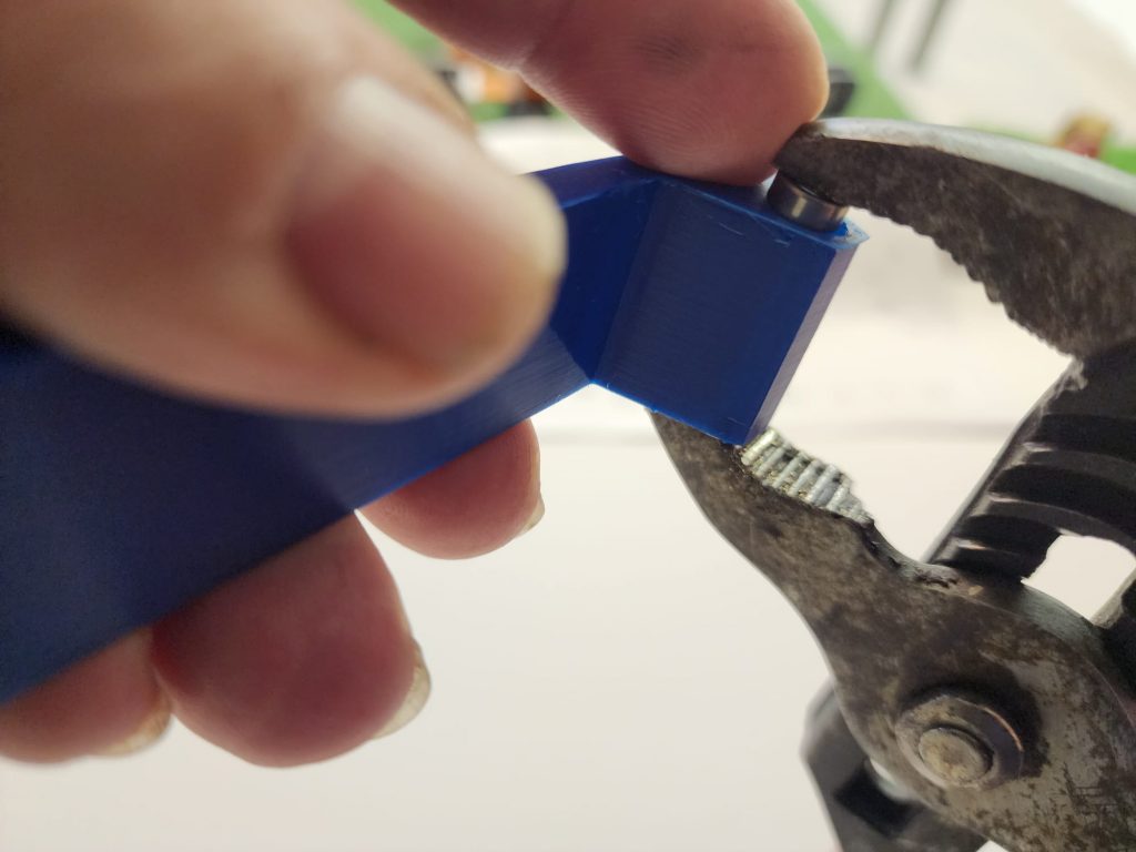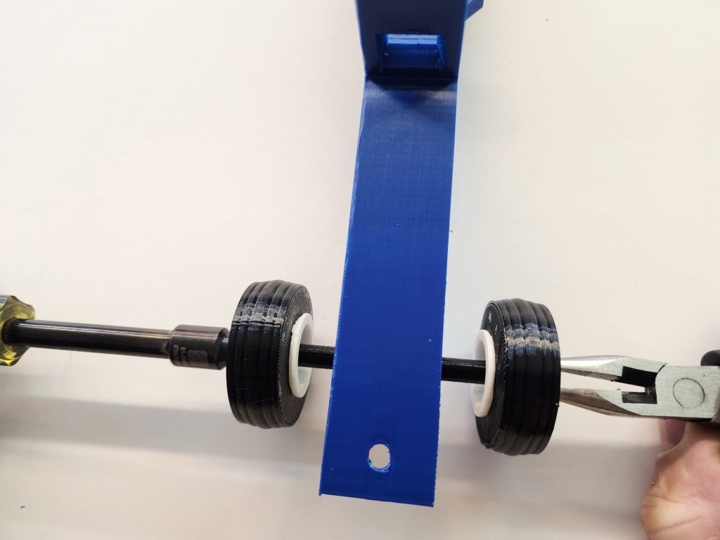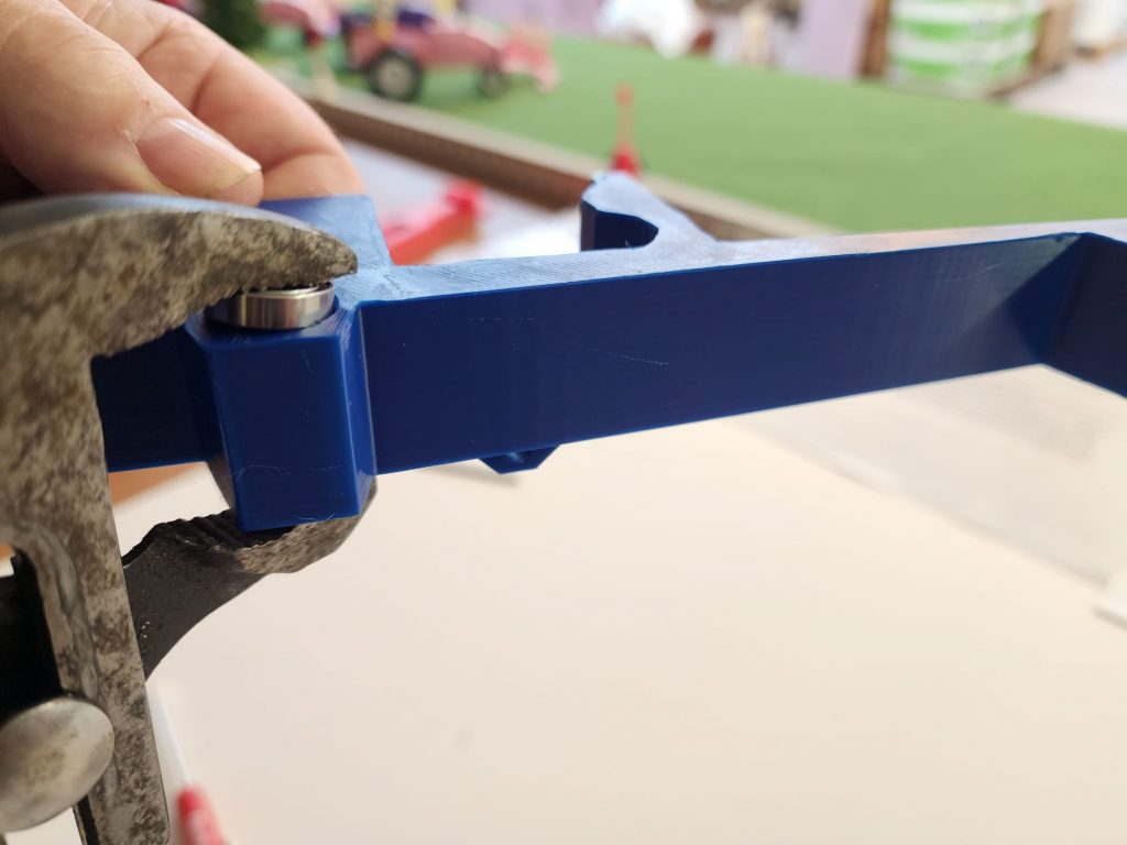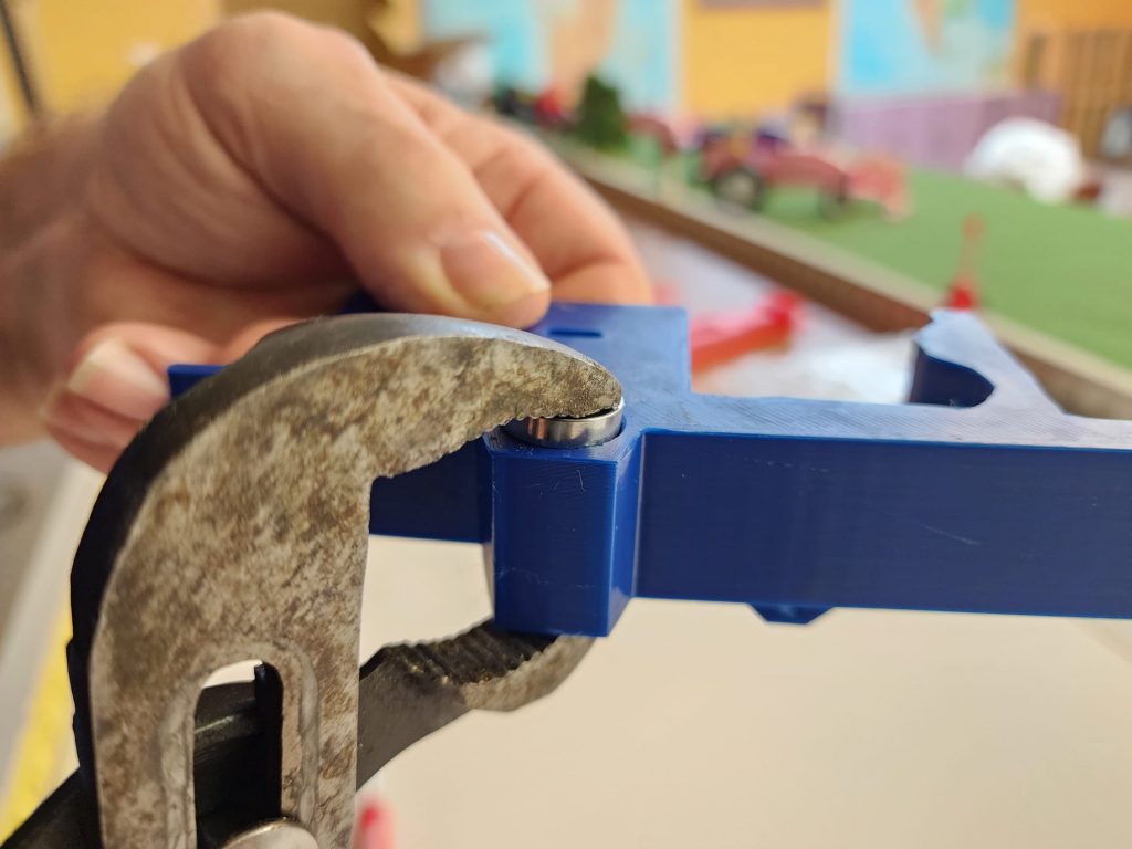 Press the axle bearings, (#2 and #3), in their respective places of the frame, (#1). This may work best using a bench vice or the spindle of a drill press with a dowel mounted in the chuck if they do not go into place by hand. You may also use slip joint pliers or c-clamp, (see figure #2). Be careful during this process.