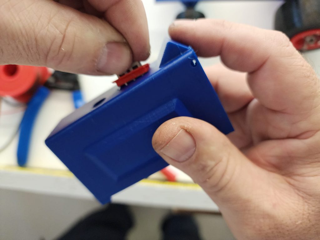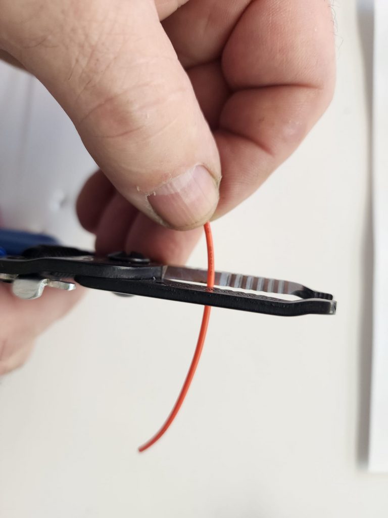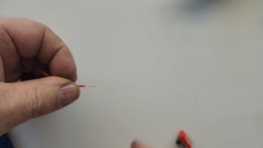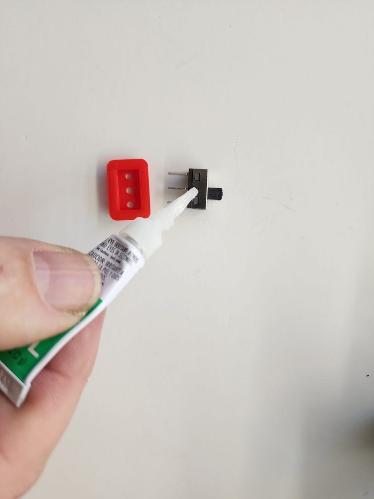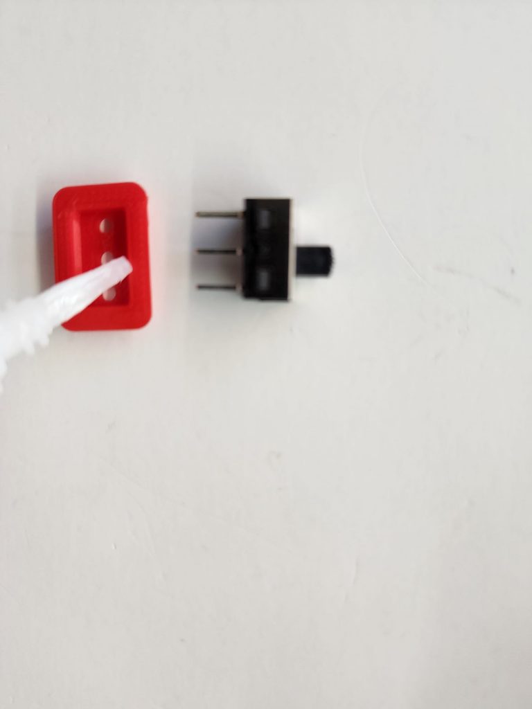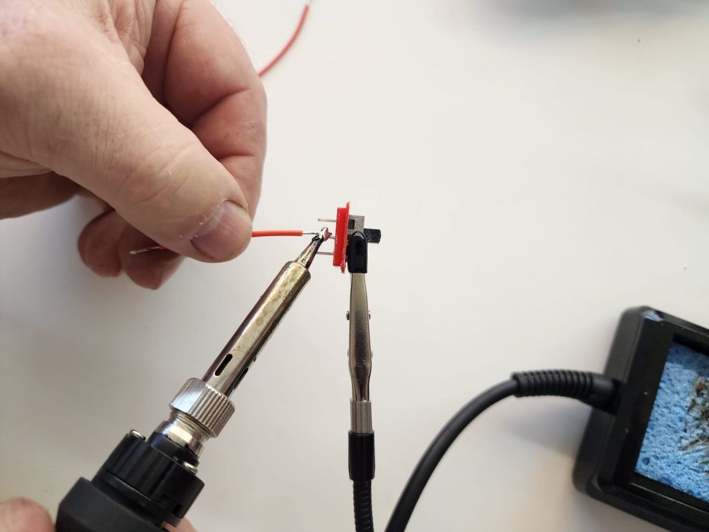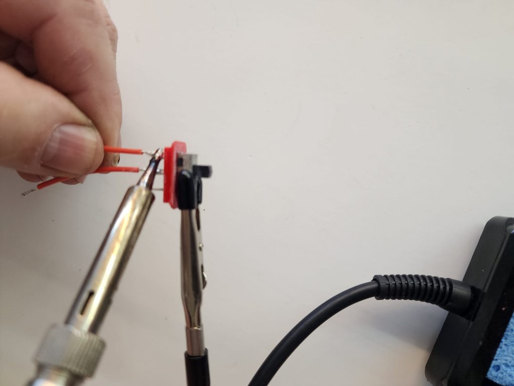 Glue the switch, (#29) into the recess of the switch housing, (#27). The switch closes the circuit between the center pin and an end pin when it is in position towards either pin. Cut 2 red wires about 2 inches long. Using wire strippers, remove about 3/8” insulation on each end. Tin and solder these wires onto the switch, one on the center pin and one on another pin. (See figure #11 Wiring Diagram). Also see our Soldering video on kaminc.us, for hints/instructions on tinning/soldering. You can also purchase soldering tools/supplies on the website.