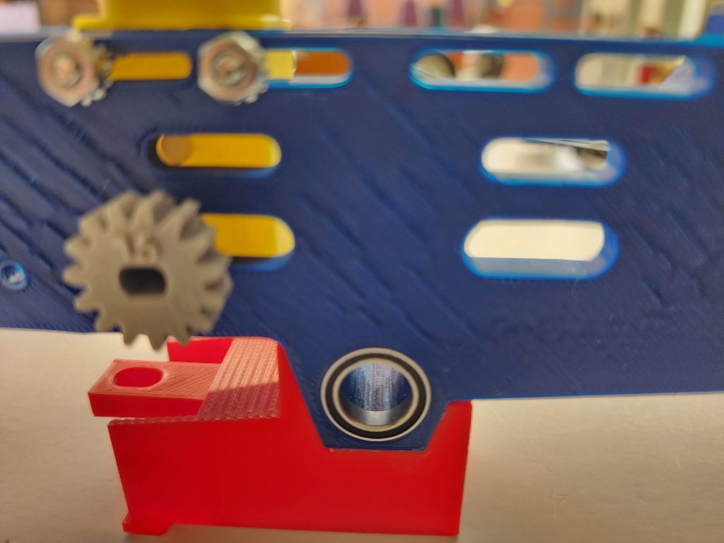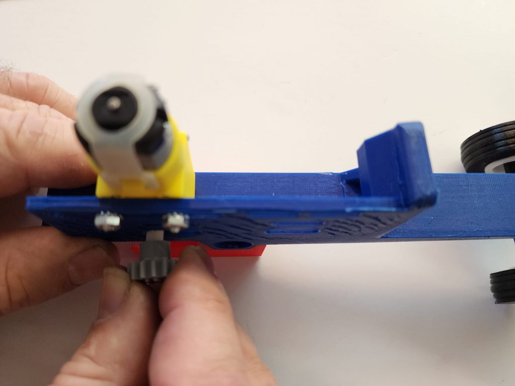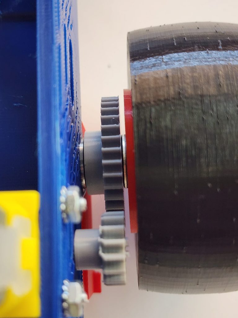 The 90-degree gearmotor setup allows for easy gear change. The kit is supplied with two pinions, 15 tooth and 20 tooth, they attach to the output shaft of the gearmotor. There are 3 planetary gears, 32, 40, and 44. Typically when the tractor is lighter, or the track is slippery, you will want a faster gear. The opposite is true when you add more weight, or the track is sticky. Again, ideally at the end of the pull you want enough torque on the rear wheels to lift the front and slip the tires.
